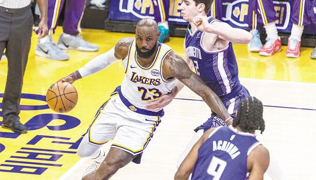 12月28日,湖人队球员勒布朗·詹姆斯(左)在比赛中带球进攻。当日,在2025-2026赛季NBA常规赛中,洛杉矶湖人队主场125比101战胜萨克拉门托国王队。 新华社发